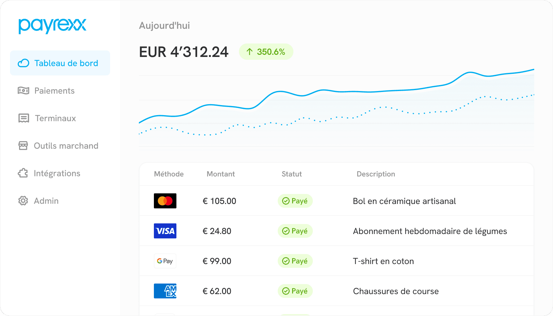 Le logiciel de Payrexx te permet d'obtenir une vue d'ensemble simple et complète de toutes les transactions effectuées. Dans ton Dashboard, tous les paiements sont listés, y compris le statut, le montant, la description, les informations client et la date.