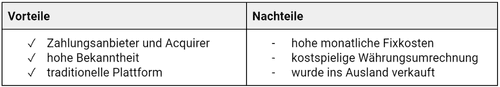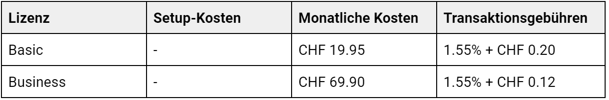 Die Setup-Kosten sind nicht auf der Website von Datatrans zu finden und es wurde ein Durchschnittswert von CHF 100 angenommen. Zudem beträgt die Minimalverrechnung pro Monat CHF 290 (ohne externe Acquiringkosten) und zusätzlich zu den Kosten von Datatrans fallen externe Acquiring Gebühren von circa 2% an.