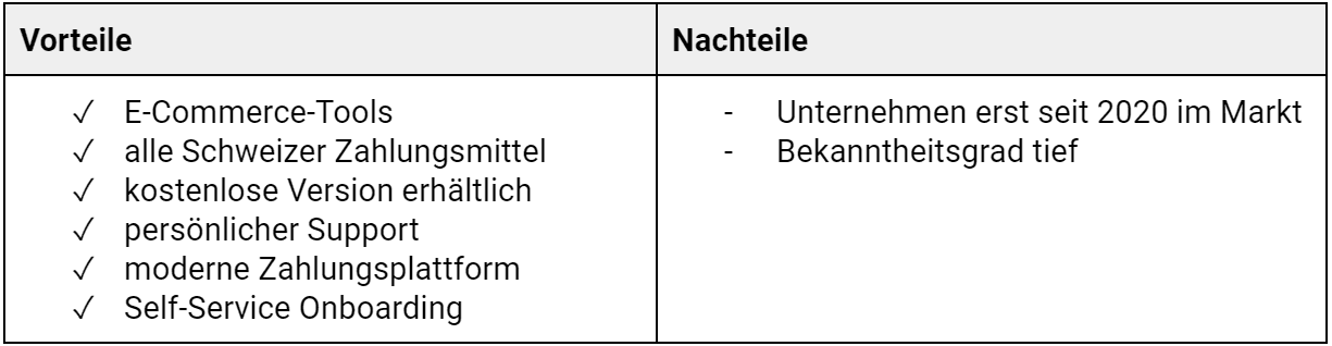 Die Möglichkeit, den Anbieter und dessen Funktionen in einer kostenlosen Phase zu testen, ist für Händler:innen von grossem Vorteil, da man dadurch sicherstellen kann, dass der Zahlungsanbieter den Bedürfnissen entspricht. Datatrans, Payrexx, PostFinance, wallee, Worldline, saldiaPay und zahls.ch ermöglichen der Kundschaft, den Anbieter auszuprobieren.