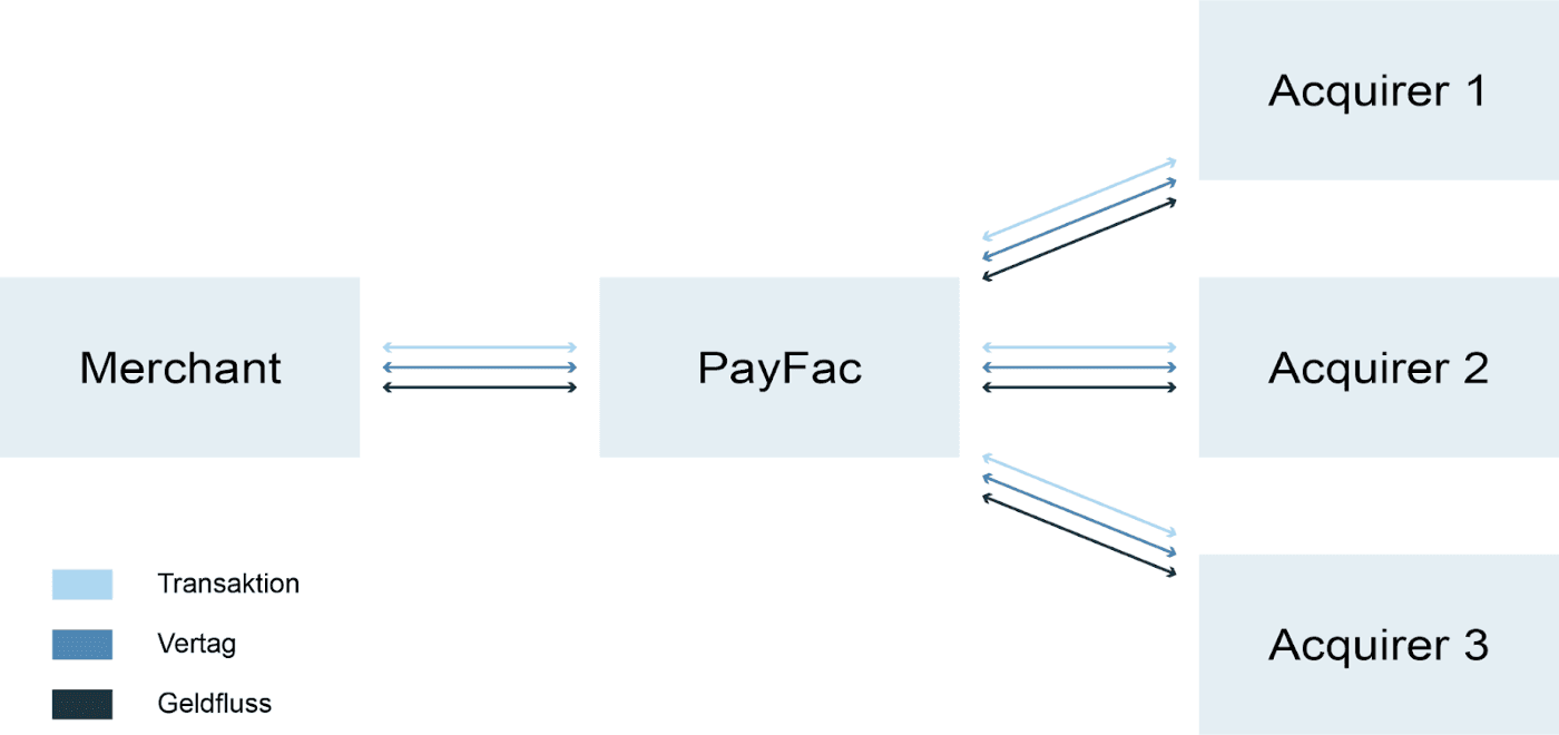 Ein Payment Facilitator (auch PF oder Collecting PSP) steht in unmittelbarem Kontakt zum:r Händler:in und verwaltet das Konto beim Acquirer. Der Payment Facilitator kann den Akzeptanzvertrag im Namen des Acquirers unterzeichnen und erleichtert so die Einrichtung, weil die:der Händler:in weniger direkte Beziehungen hat. Der Payment Facilitator ermöglicht also die Integration verschiedener Zahlungsmethoden im Onlineshop mit nur einem Vertrag.