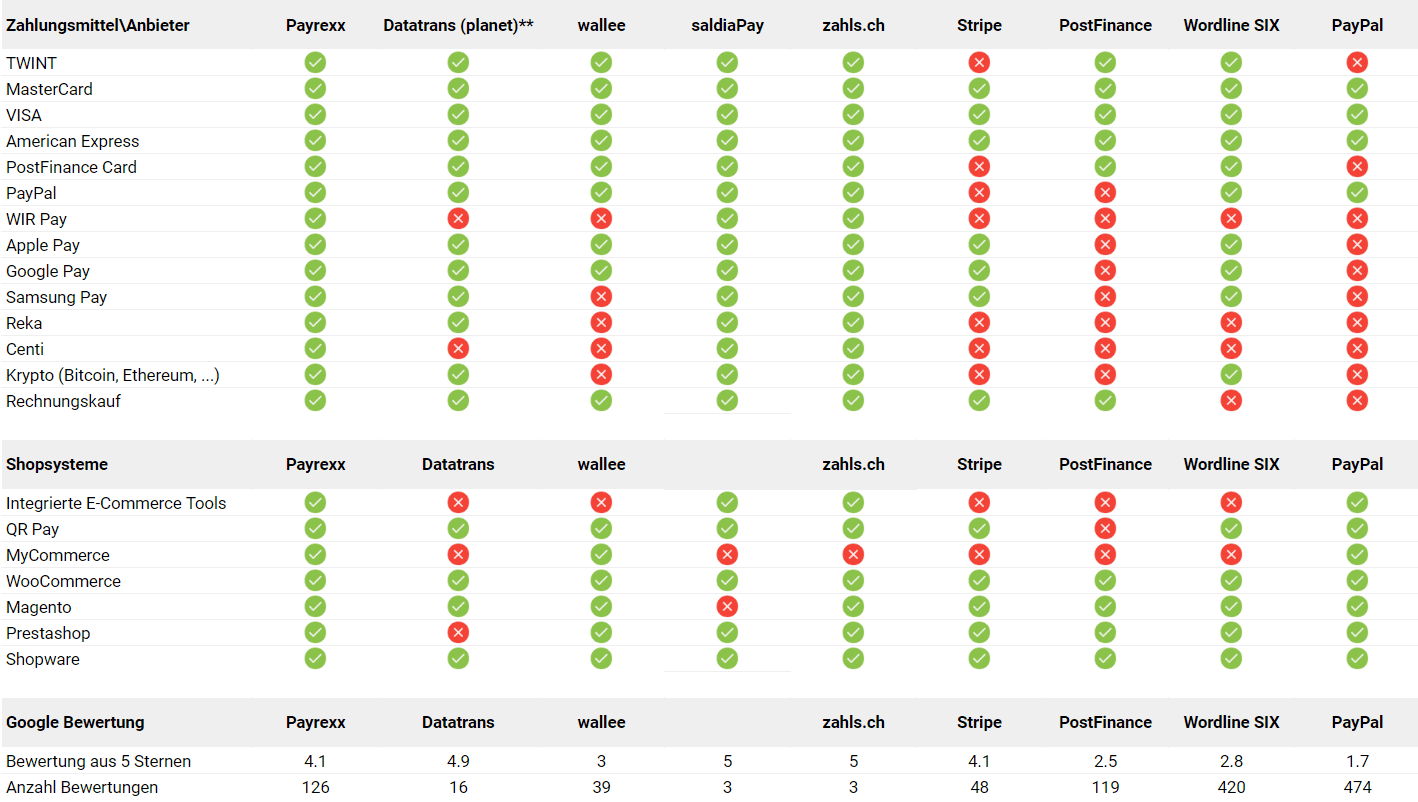 In der folgenden Tabelle ist ersichtlich, welcher Zahlungsanbieter welche Zahlungsmethoden* zur Verfügung stellt, welche Shopsysteme kompatibel sind und wie die Unternehmen auf Google bewertet werden.