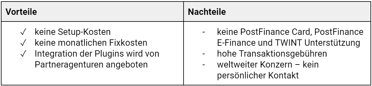 In der Einfachheit der Installation überragen PayPal, Payrexx und zahls.ch die anderen Zahlungsanbieter. In der allgemeinen Implementierung ist Stripe umfangreicher als die anderen Anbieter. Bei PostFinance benötigt man für die Installierung der Plugins erweiterte Entwicklerkenntnisse.