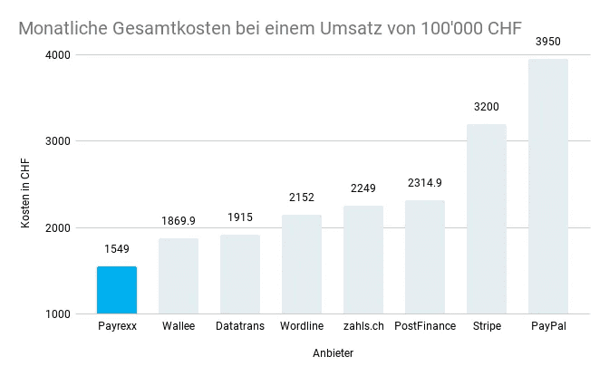 Die niedrigsten Gebühren hat man mit Payrexx, dicht gefolgt von wallee. Mit Kosten von 790 CHF ist PayPal für Onlineshops mit diesem Volumen am kostspieligsten. Der absolute Preisunterschied zwischen Payrexx und PayPal beträgt 421 CHF. Folglich sind die Kosten beim günstigsten Zahlungsanbieter Payrexx um mehr als 50 % niedriger als beim teuersten Angebot.