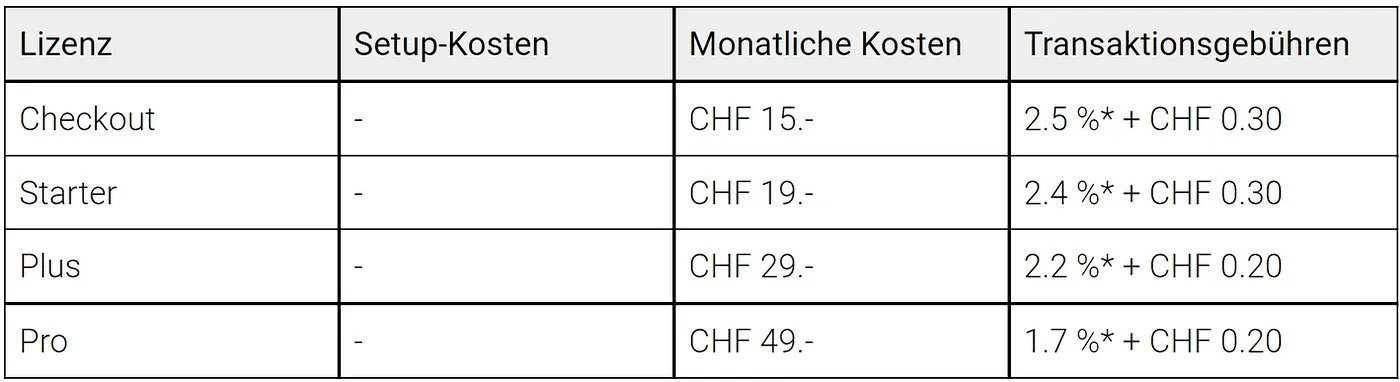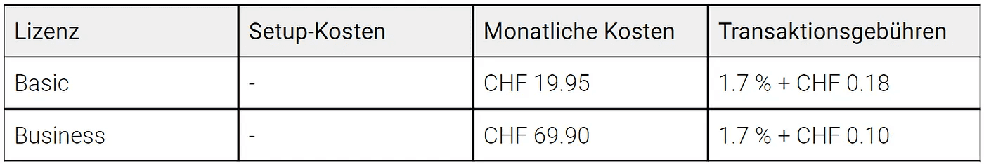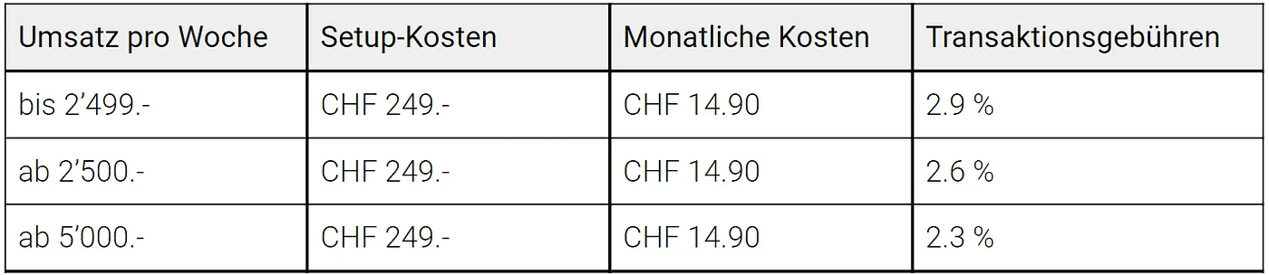 Die Transaktionsgebühren betragen 2.9 % und 0.3 CHF pro Transaktion. Es fallen weder einmalige Einrichtungskosten noch fixe monatliche Gebühren an. Für Rückerstattungen werden keine zusätzlichen Gebühren verlangt.