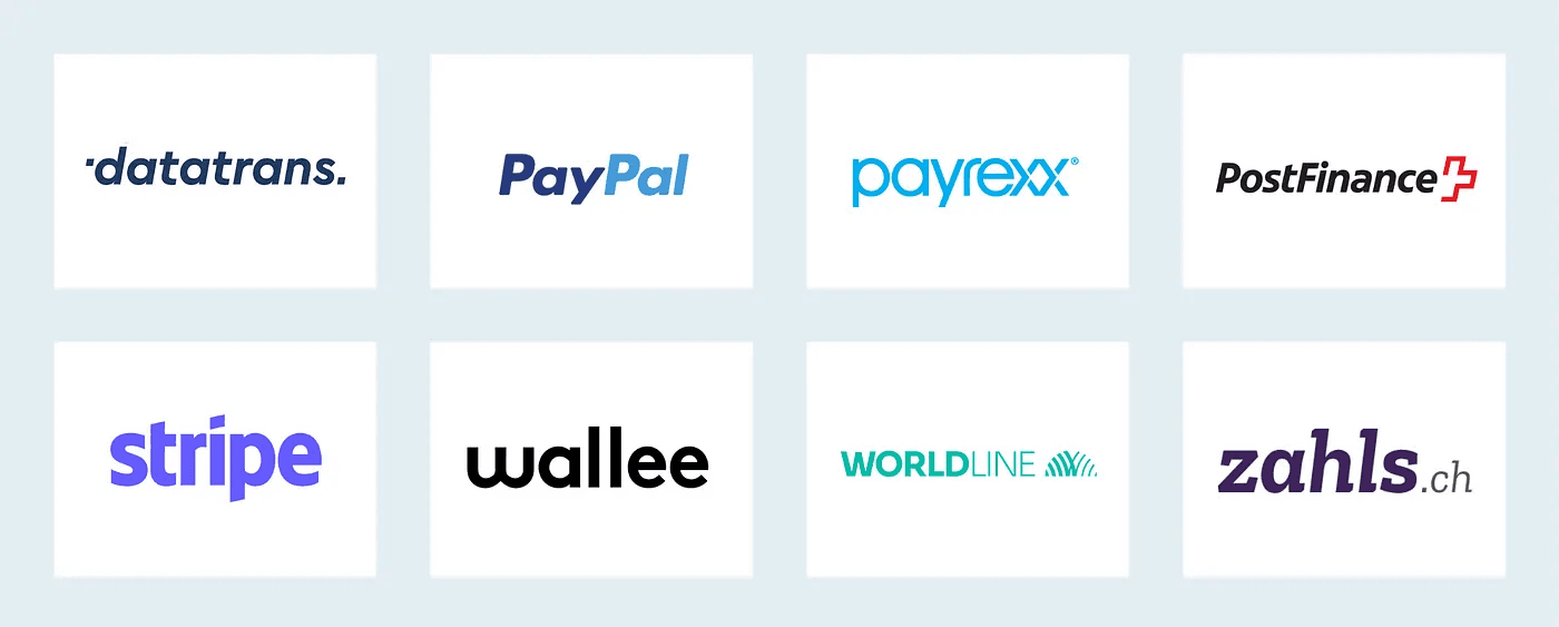 Datatrans, PayPal, Payrexx, PostFinance, Stripe, wallee, Worldline, zahls.ch