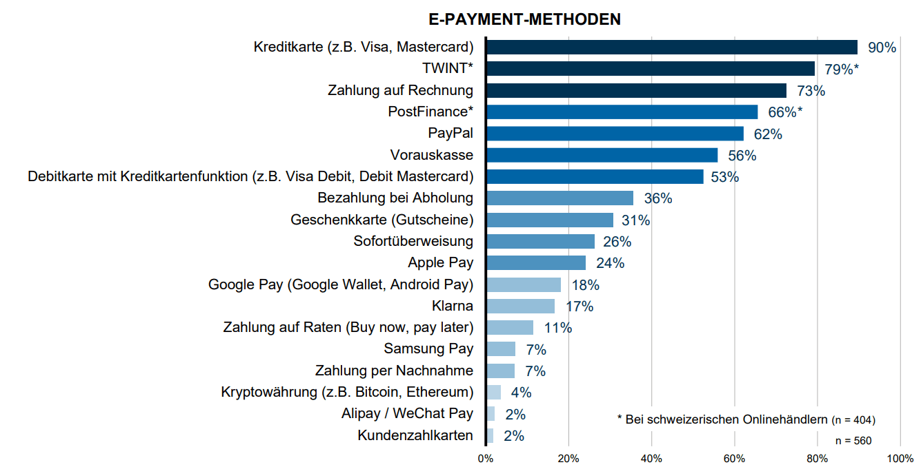 Wie die Onlinehändlerbefragung auch zeigt, sind Kreditkarte, TWINT*, Rechnung, PostFinance* und PayPal die am häufigsten verwendeten Zahlungsmethoden in Onlineshops, aber auch innovative mobile Zahlungslösungen und Buy Now Pay Later (BNPL)-Lösungen gewinnen an Beliebtheit. Onlinehändler:innen sind allgemein bestrebt, innovative Zahlungslösungen zu integrieren und ihren Kund:innen eine breite Palette an Optionen zu bieten.