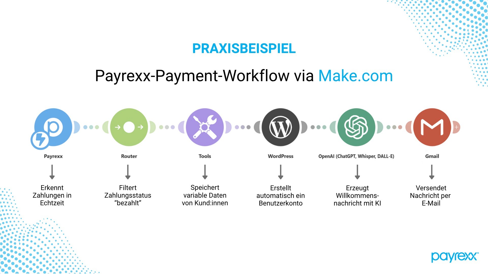 Auf Basis dieser Informationen wird automatisch ein Benutzerkonto auf der WordPress-Seite des Start-ups erstellt. Über die OpenAI-Schnittstelle generiert das System mithilfe von KI (zum Beispiel ChatGPT), eine personalisierte Begrüssungsnachricht, die direkt über Gmail oder ein anderes E-Mail-Programm an den oder die Kund:in versendet wird.Mit der Integration in Make.com verfolgt Payrexx das Ziel, insbesondere kleinen und mittleren Unternehmen eine unkomplizierte, sichere und zeitsparende Zahlungsabwicklung zu ermöglichen.