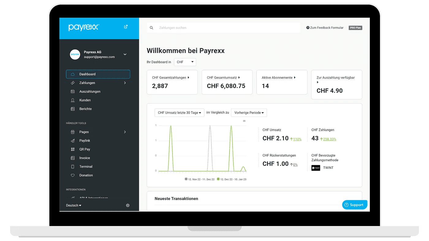 Zudem müssen Sie nicht mehr den Überblick über verschiedene Systeme behalten und mehrere Excel-Tabellen verwalten. Mit Payrexx haben Sie alle Ihre Zahlungen auf einem einzigen Dashboard.