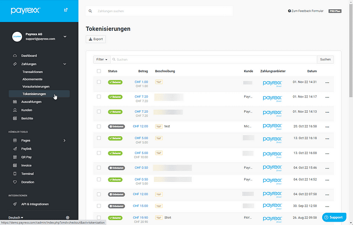In deinem Payrexx Konto - Übersicht aller Tokenisierungen