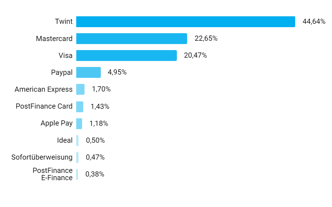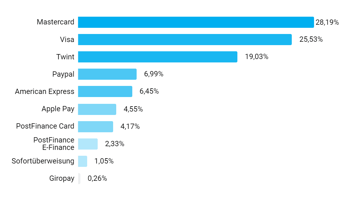 Anders als bei der Anzahl der Transaktionen liegt beim Volumen das Zahlungsmittel Mastercard mit einem Anteil von 28,19 % auf Platz eins, gefolgt von Visa (25,53 %) und TWINT (19,03 %) auf den Plätzen zwei und drei. Dies lässt in Verbindung mit der vorangegangenen Statistik den Schluss ziehen, dass mit TWINT zwar mehr Zahlungen getätigt werden, diese jedoch kleinere Beträge beinhalten, als in diesem Fall Zahlungen mit Kreditkarten wie Mastercard oder Visa. Auf den Plätzen vier und fünf befinden sich Paypal mit 6,99 % und American Express mit 6,45 % Anteil am gesamten Transaktionsvolumen.