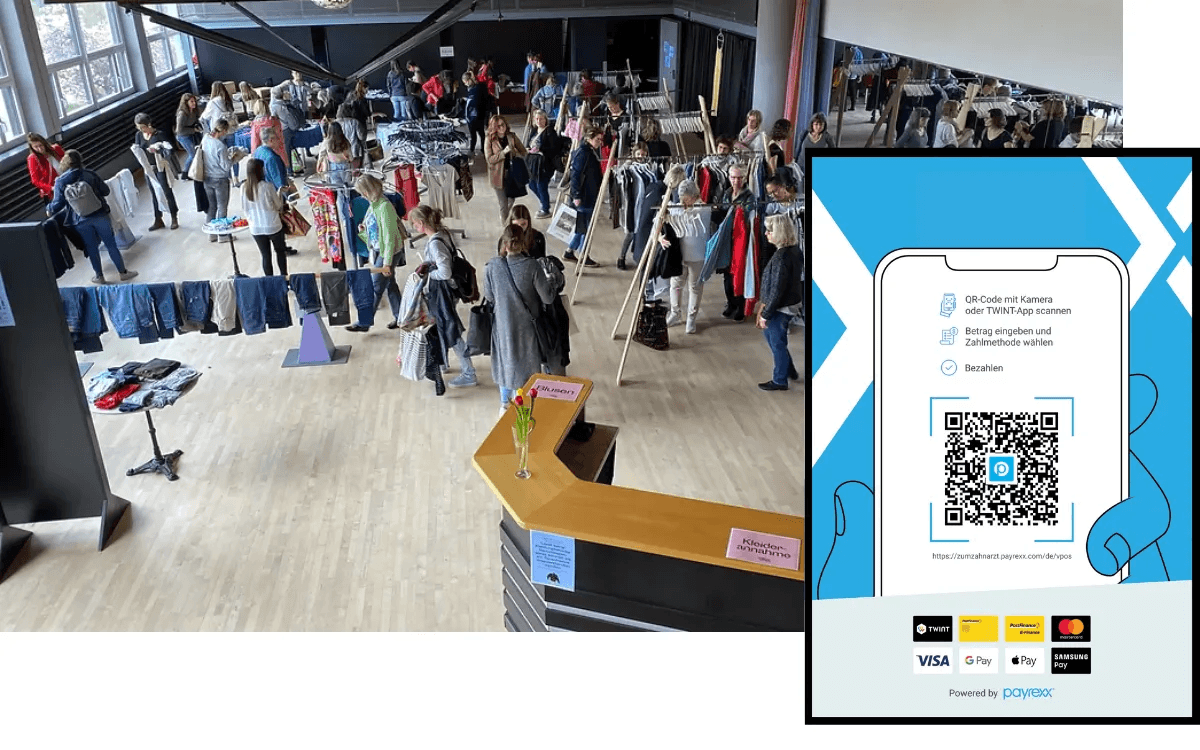 An Ihren Kleidertauschbörsen nutzen die Standortverantwortlichen von Walk-in Closet das Payrexx-Tool QR-Pay, um QR-Zahlungscodes zu erstellen. Diese können entweder online oder ausgedruckt als Poster oder Aufsteller verwendet werden. Auf diese Weise können die Besucher:innen der Kleidertauschbörsen ganz einfach den QR-Code am Eingang scannen und mit ihrer bevorzugten Zahlungsart den Eintritt bezahlen.