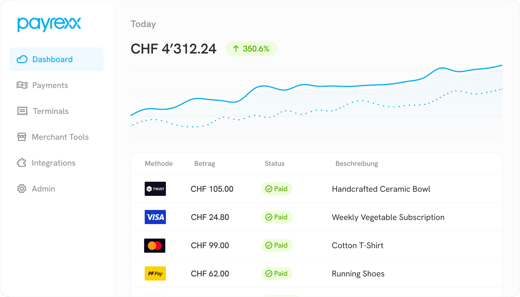 All transactions that you process using Payrexx will be paid out to the bank account you have provided, according to the specified billing period. This ensures the most reliable and secure payout.