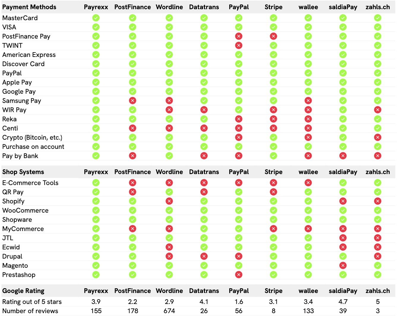 In summary, it is worthwhile to consider newer and lesser-known providers. They often offer equally powerful and cost-effective payment solutions and can also better address the individual needs of the merchants. For small and medium-sized shops, Payrexx and wallee are a good choice, while established providers might be more advantageous for larger companies. In terms of price, range of features, and user-friendliness, Payrexx is clearly among the front-runners.