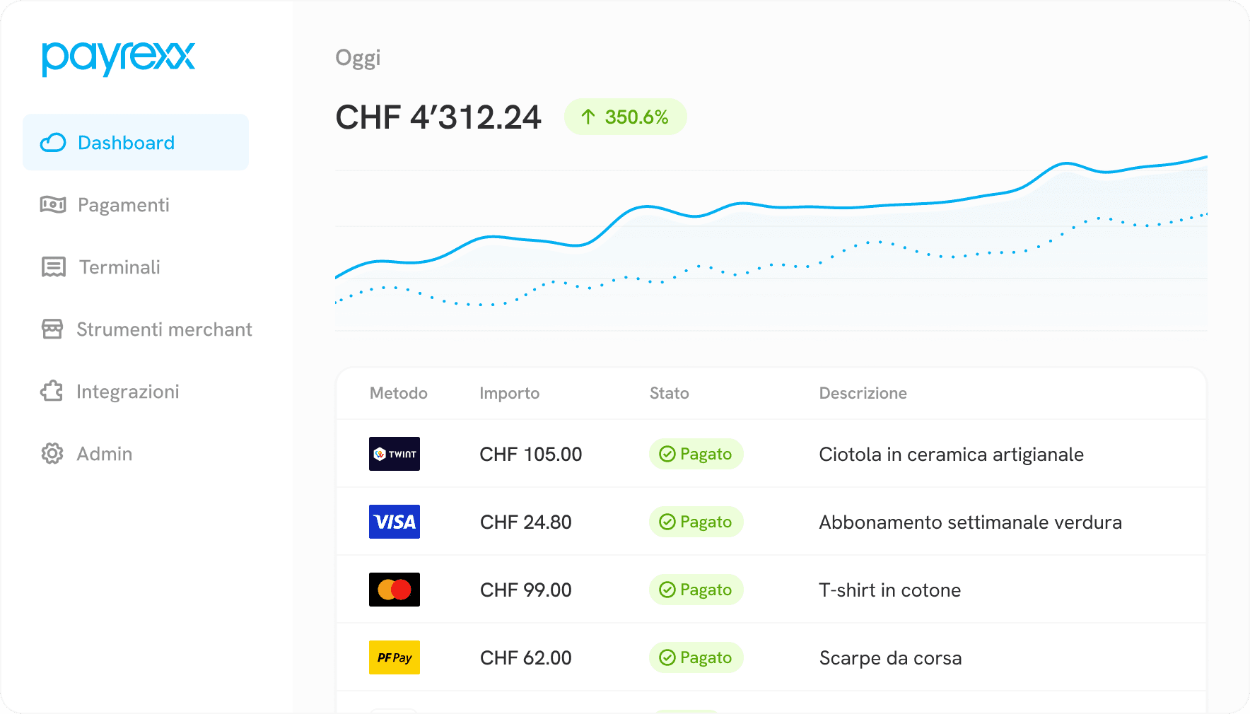Il software di Payrexx ti offre una panoramica semplice e completa di tutte le transazioni effettuate. Nel tuo Dashboard sono elencati tutti i pagamenti, inclusi stato, importo, descrizione, dati dei clienti e data.
