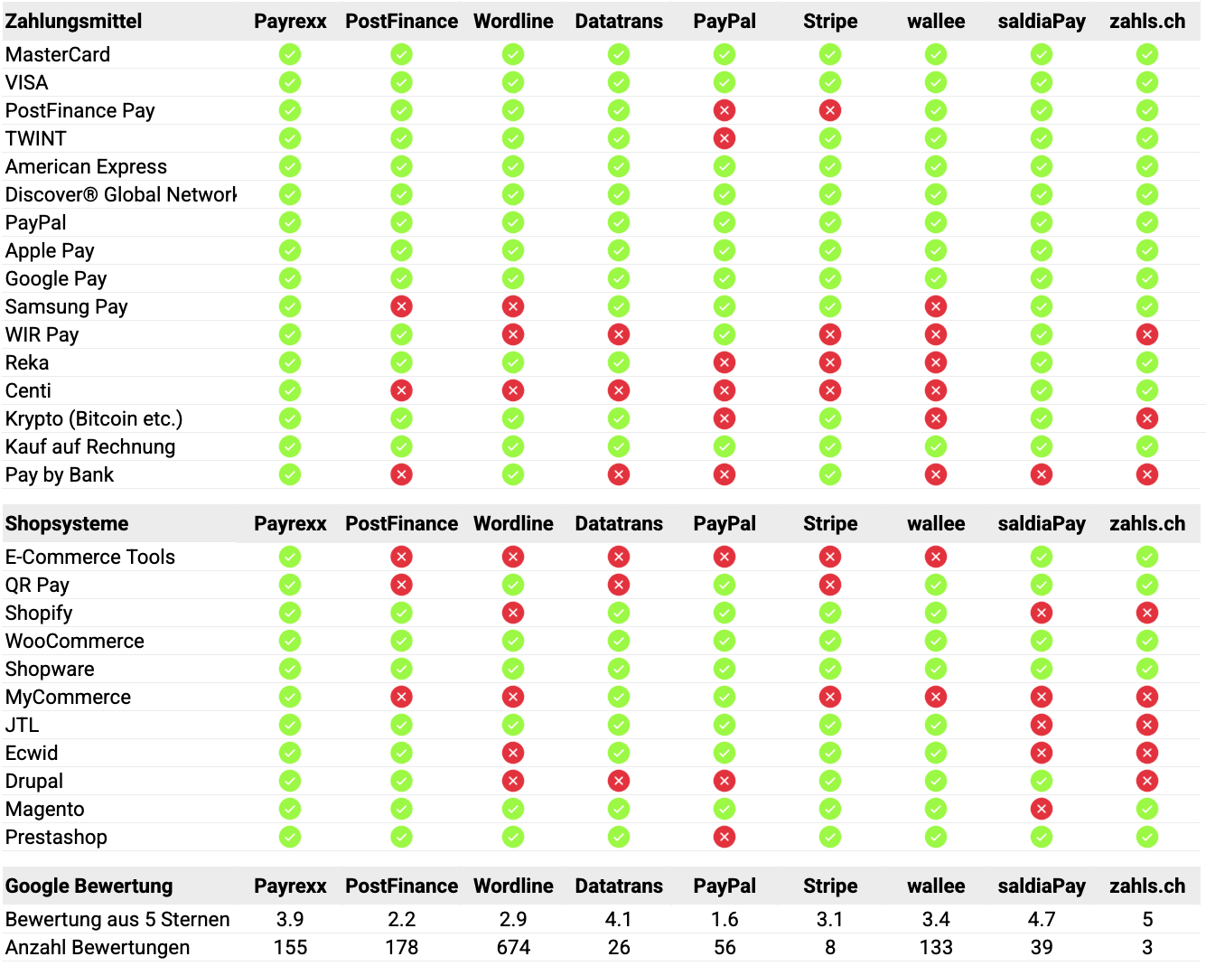 Un altro punto importante è la scelta dei metodi di pagamento. Sebbene tutti i provider offrano un'ampia gamma di opzioni di pagamento, la differenza sta spesso nel supporto di metodi di pagamento regionali come TWINT, PostFinance, Reka e altri. I provider svizzeri come Payrexx, Datatrans, saldiaPay o zahls.ch hanno un vantaggio in questo senso. Chi ha molti clienti internazionali, invece, può avvalersi di provider globali come PayPal o Stripe.