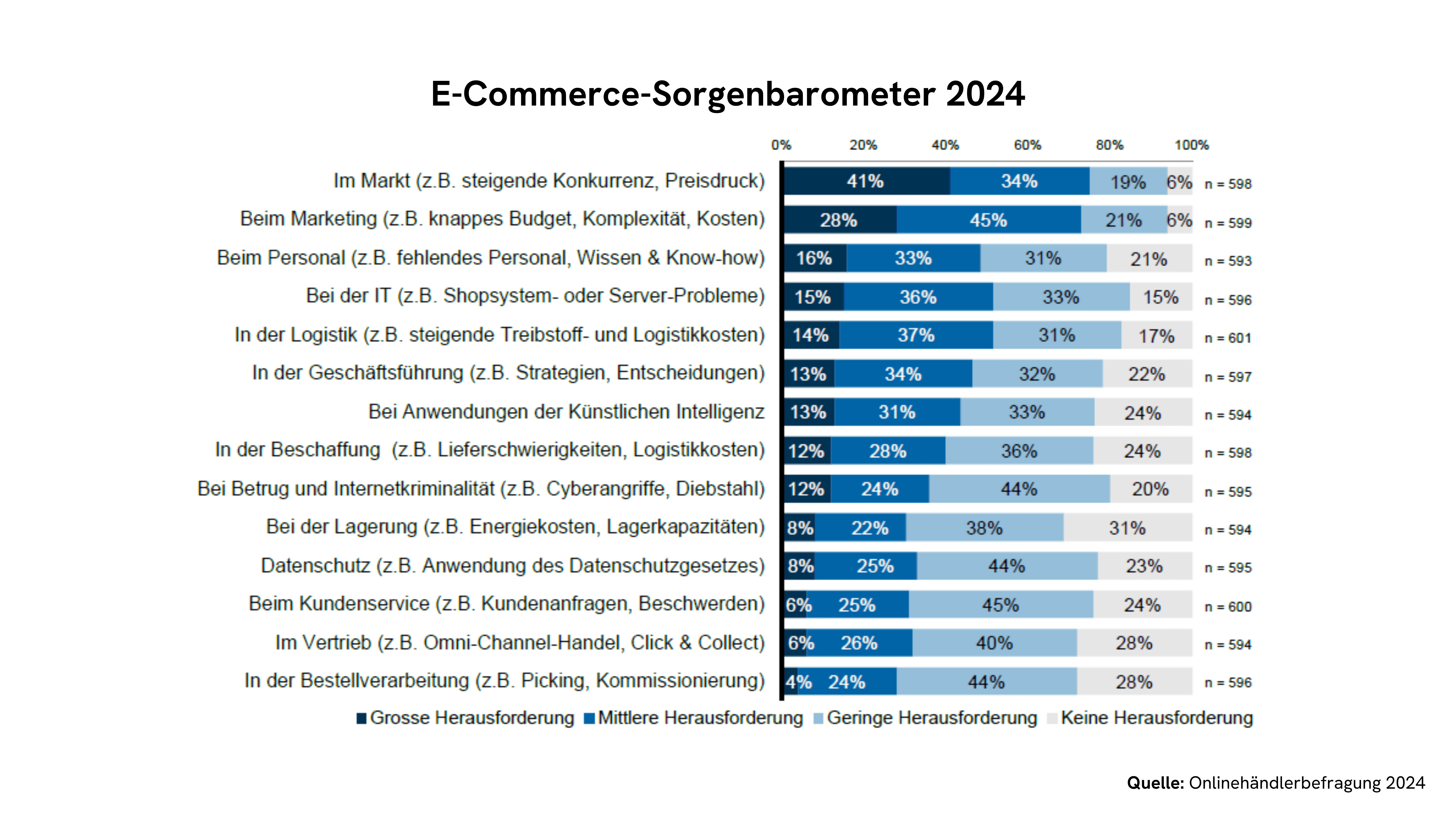 Arguably the most important part of the survey is the so-called “E-commerce Worry Barometer”, in which the traders talk about their biggest challenges. As already in 2023, the current market situation is again the main concern this year: The competition is constantly growing and the price pressure continues to increase.