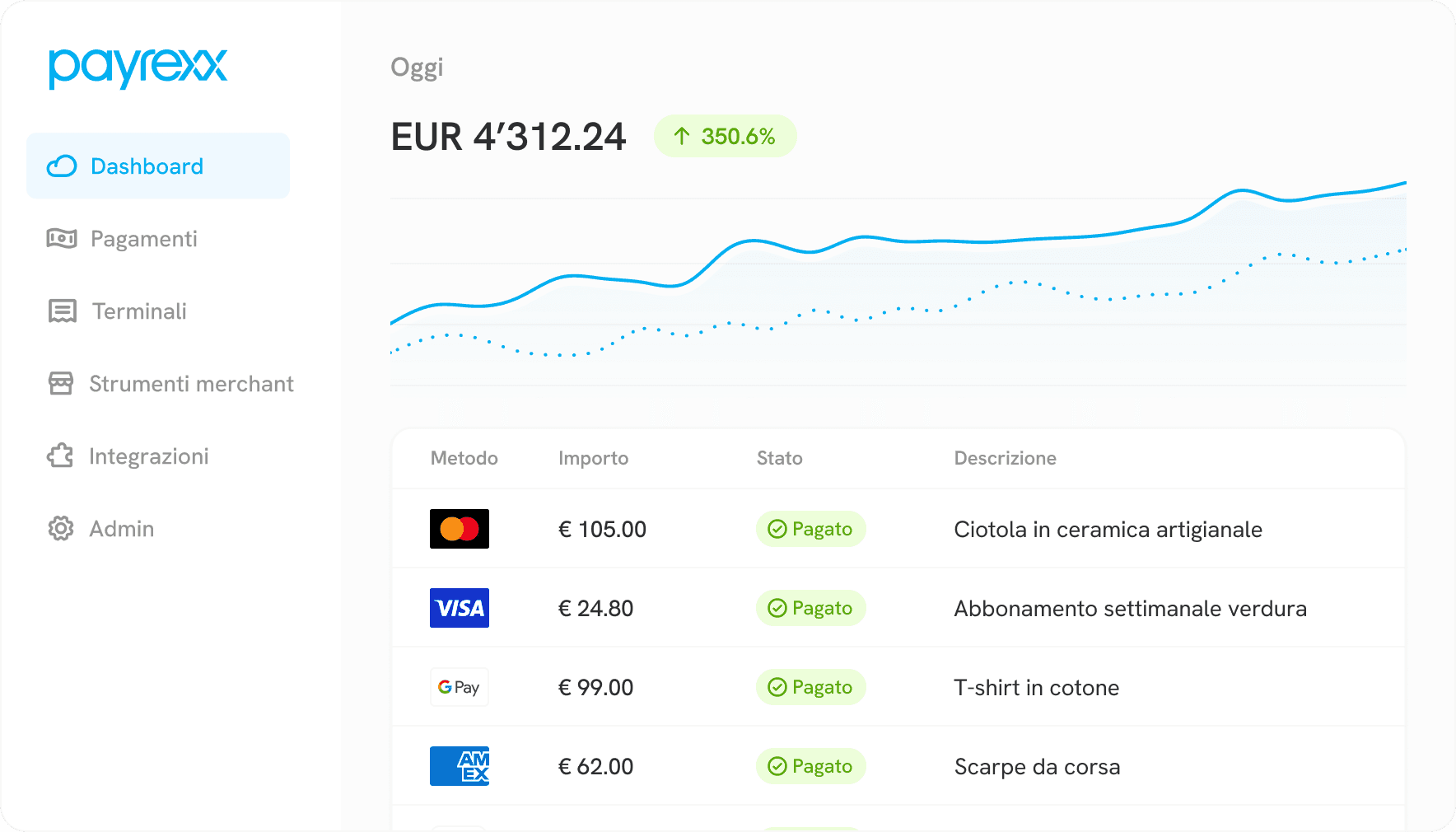 Il software di Payrexx ti offre una panoramica semplice e completa di tutte le transazioni effettuate. Nel tuo Dashboard sono elencati tutti i pagamenti, insieme a stato, importo, descrizione, dati cliente e data.